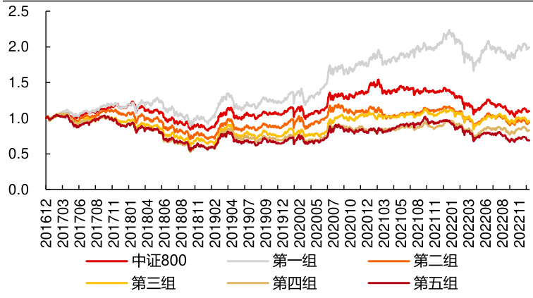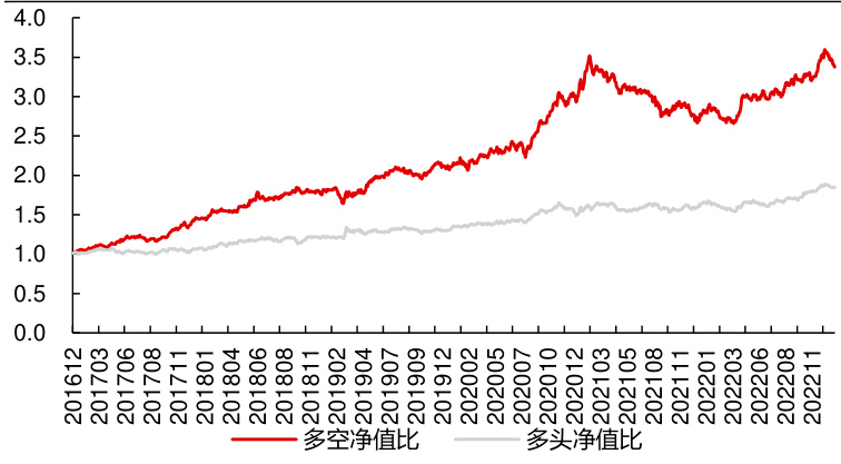 - 多头组合明显跑赢基准,而低组表现欠佳,因子有效性明显,
