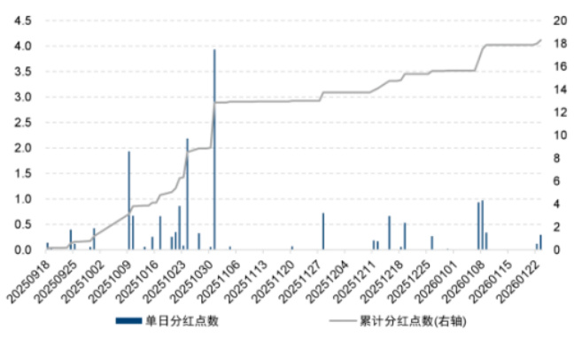 例如,上证50(图12)显示分红点数在9月下旬大幅聚集,累计分红点数快速攀升至16。其它指数图解情况类似但分红公司基数差异较大。
