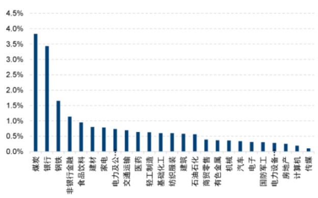 图1是各行业已公布分红预案的股票股息率中位数的柱状图,煤炭行业股息率最高约 $3.8\%$,银行和钢铁行业也分别接近 $3.5\%$ 和 $1.5\%$。而传媒、计算机等行业股息率则较低,不足 $0.5\%$,体现了高股息行业多属于传统资源类或金融板块,科技行业则普遍偏低。