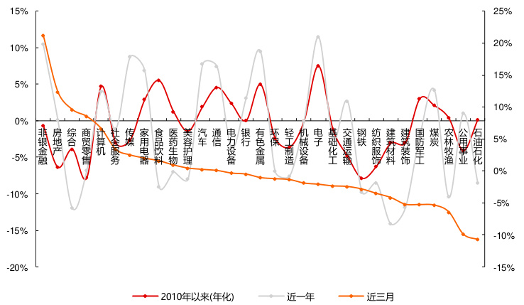 - 对比近三个月、近一年、2010年以来不同一级行业的收益分布。