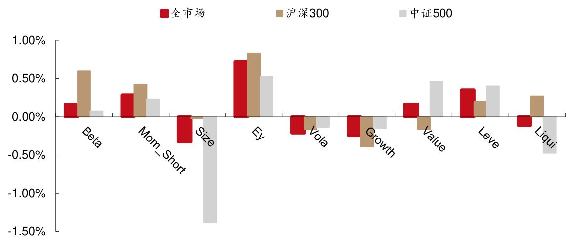 - 全市场内,短期动量(Momentum_Short)和收益率(Earnings Yield)因子RankIC为正,小市值(Size)因子为负,代表小市值因子短期表现不佳。
