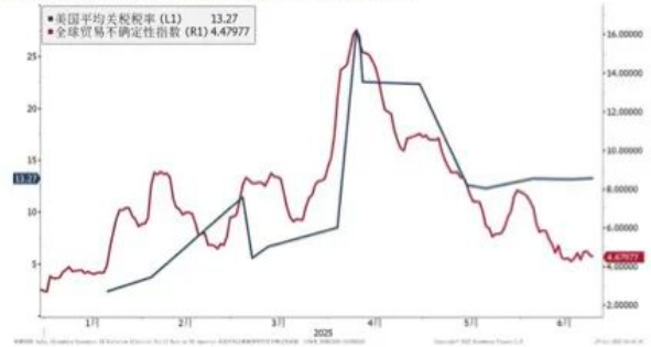 - 2025年7月起美国与多国达成关税协议,部分产品关税下调或取消,贸易不确定性指数明显下降。
