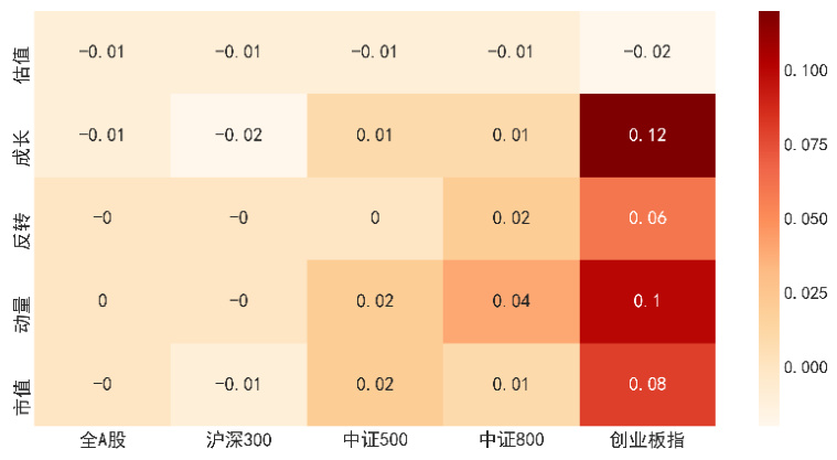 - 创业板稍微体现与成长、动量更高正相关,可能反映新兴成长股特性。