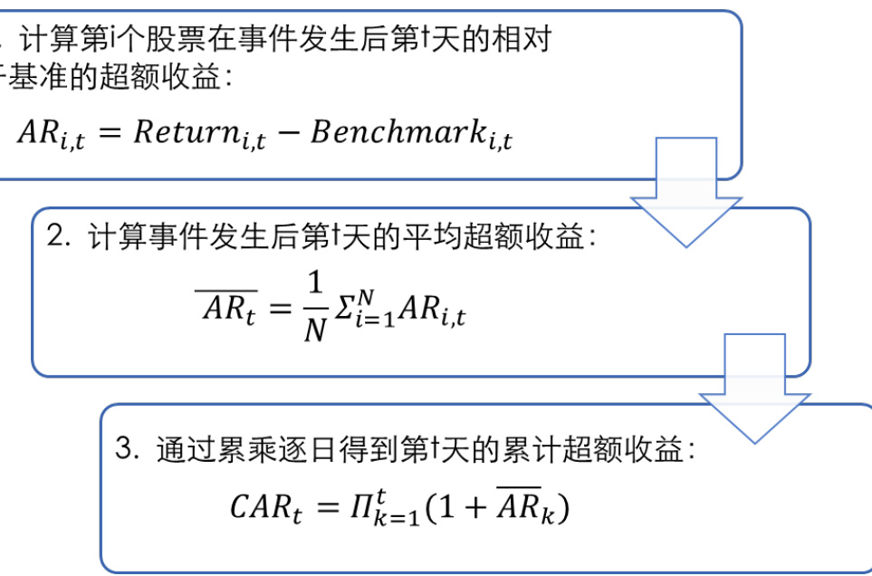 - 强调超额收益的反事实定义:事件股票实际收益与假设未发生事件的收益差异。