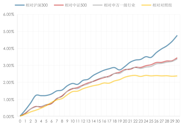 - 量化了事件不同时间点(5、10、20日)下相对不同基准及对照组收益。