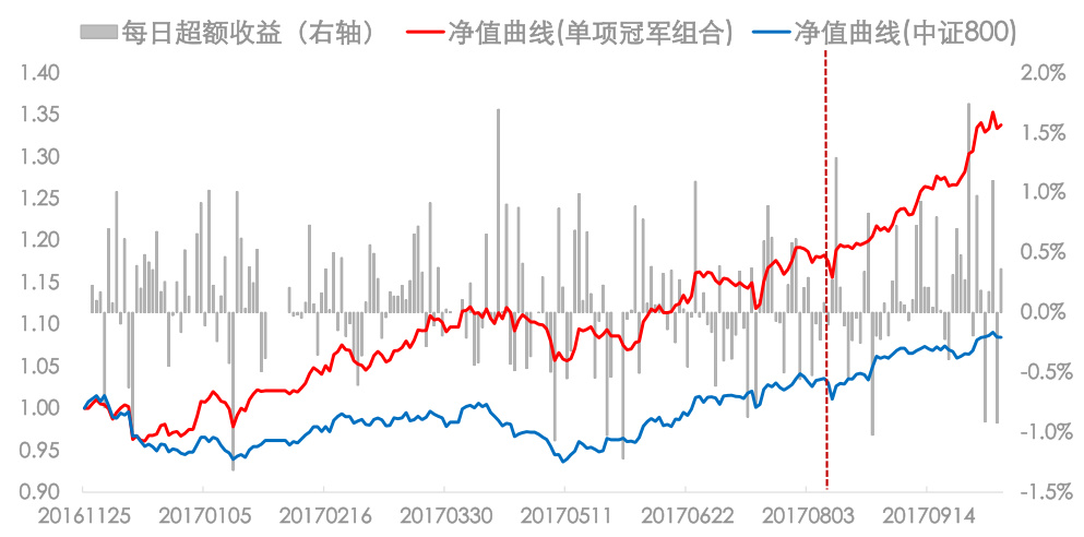 - 展示内容:2016年11月25日至2017年7月底单项冠军组合净值曲线(红线)及中证800指数净值曲线(蓝线),每日超额收益柱状图(灰色,右轴)。