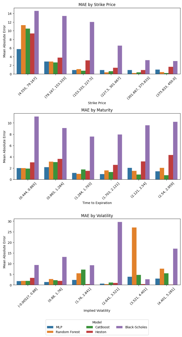 - 按隐含波动率分组:误差随波动率升高波动显著,其中Black-Scholes误差增长最快,Heston好转,ML尤其是CatBoost和MLP展示出较强的鲁棒性,反映其能捕捉多层次波动率动态。[page::7]