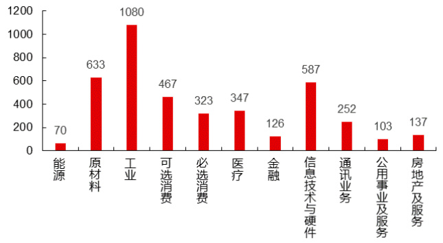 - 工业(1080个)、原材料(633个)和信息技术与硬件(587个)共占总数的55.8%。