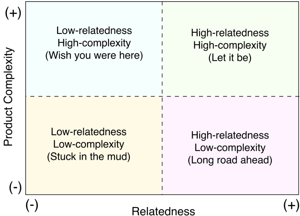 - 解读:该图为经济复杂性学中常用工具,反映经济体进入某活动的易行性与潜在价值。
