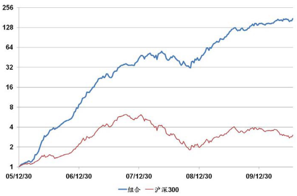 - 通过对2005年末起至2009年底沪深300指数和组合累计收益的对比(图1),发现回测组合收益大幅超过指数,证明模型的预期有效性和策略潜力。