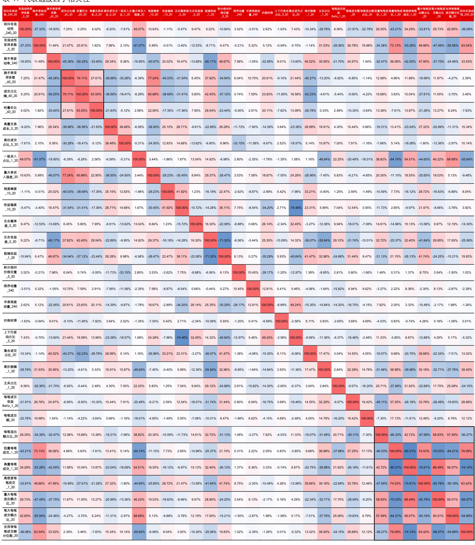 - 解读:大多数因子相关性低于40%,说明因子体系多维度信息覆盖,能够避免信息冗余,提高因子组合的多样化和有效性。