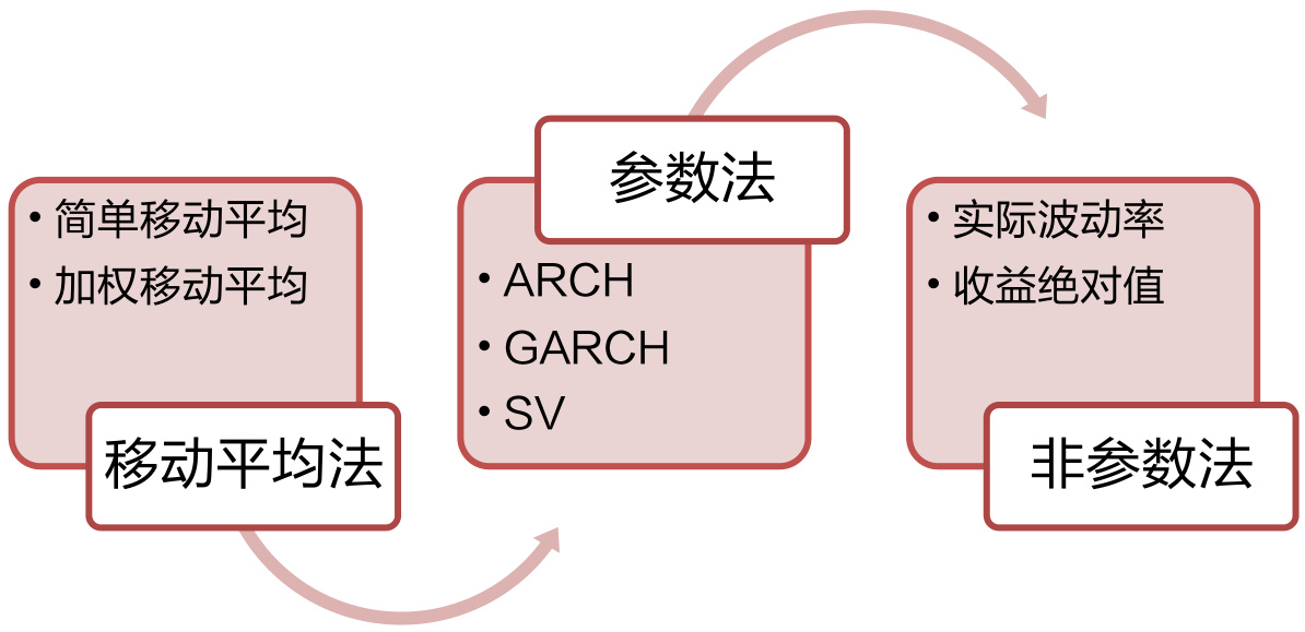 - 清晰分三大类预测方法发展:移动平均法→参数法(ARCH/GARCH/SV)→非参数法(实际波动率、收益绝对值等)。