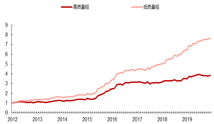 - 换手率因子(图10)与反转、市值情况类似,低质量组表现较好。