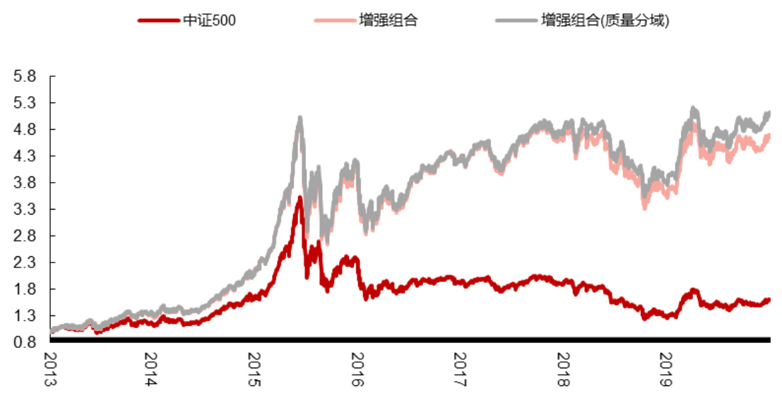 - 质量分域方法下中证500增强组合在2013-2019年取得收益和风险调整后表现均优于未分域组合。