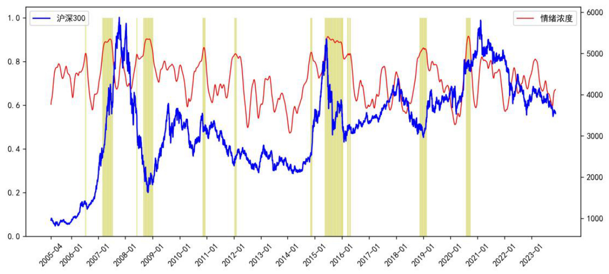 - 图3展示历年情绪浓度达警戒线的时段,黄色区域与沪深300走势几乎同步体现牛熊转换节点,表明情绪浓度作为宏观情绪指标的领先信号有效。