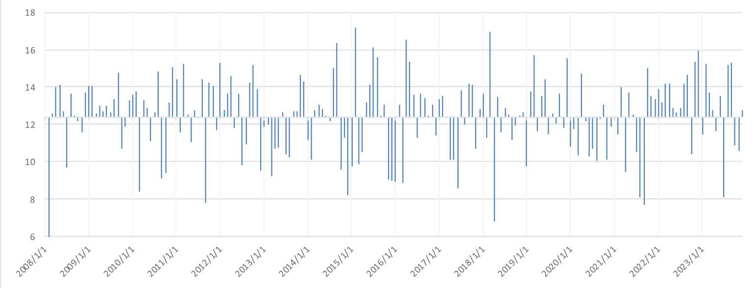 - 图12显示发出拥挤度信号的行业数自2015、2019、2020年峰值后整体回落,2023年维持较低水平,反映市场尚未出现大规模资金拥挤风险爆发。