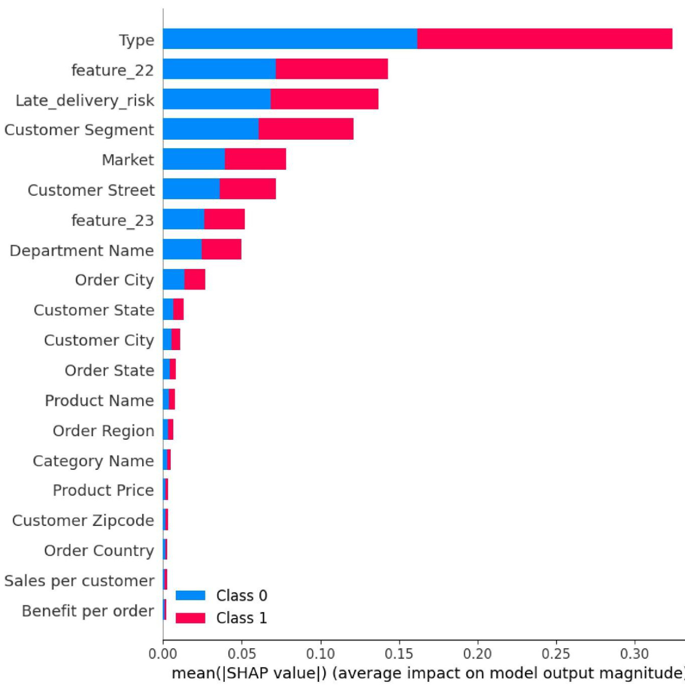 - SHAP总结条形图显示“Type”字段对欺诈检测模型贡献最大,且对正类(欺诈)判别作用最显著。