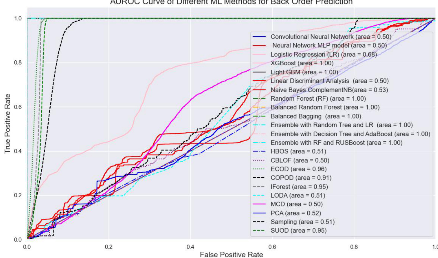 - 物料缺货预测的监督模型(XGBoost,LightGBM,随机森林及集成)同样获得完美或接近完美的AUC(1.0)。