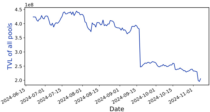 - 解析:TVL整体波动并在2024年9月中旬出现明显下跌,反映流动性变动,可能影响套利机会和市场效率。