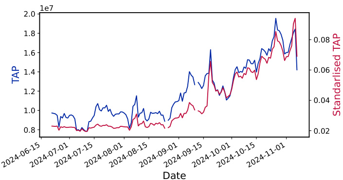 - TAP及标准化TAP均呈上升趋势,表明Uniswap V2在研究期内效率逐渐降低。