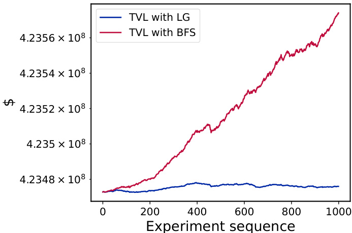 - 通过模拟两种代币路由算法(文献[1]线图算法和深度优先搜索DFS算法),表明更优路由方法能提升DEX整体效率及交易者利益,同时不同算法对流动性池TVL的影响也不同。