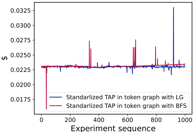 - 图8说明线图算法下目标代币收益稳定接近1000\$,DFS则波动明显;