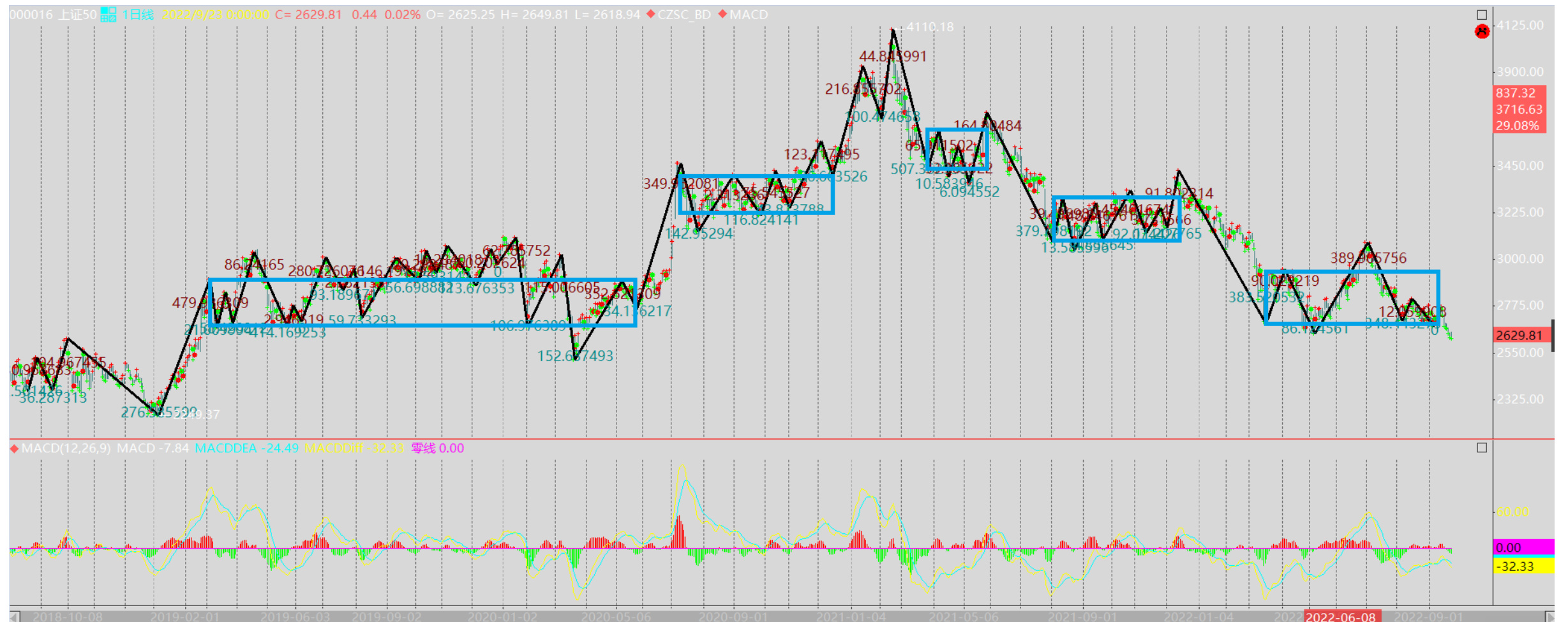 - 描述:图2通过实线和中枢蓝框标记,呈现2018年至2022年上证50波动结构。