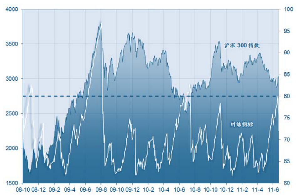 - 图2显示2005年-2011年间纠结指标与沪深300指数走势关系,阈值大致为80。