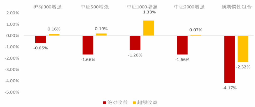 - 中证1000增强组合达到了1.33%,表现最为亮眼;