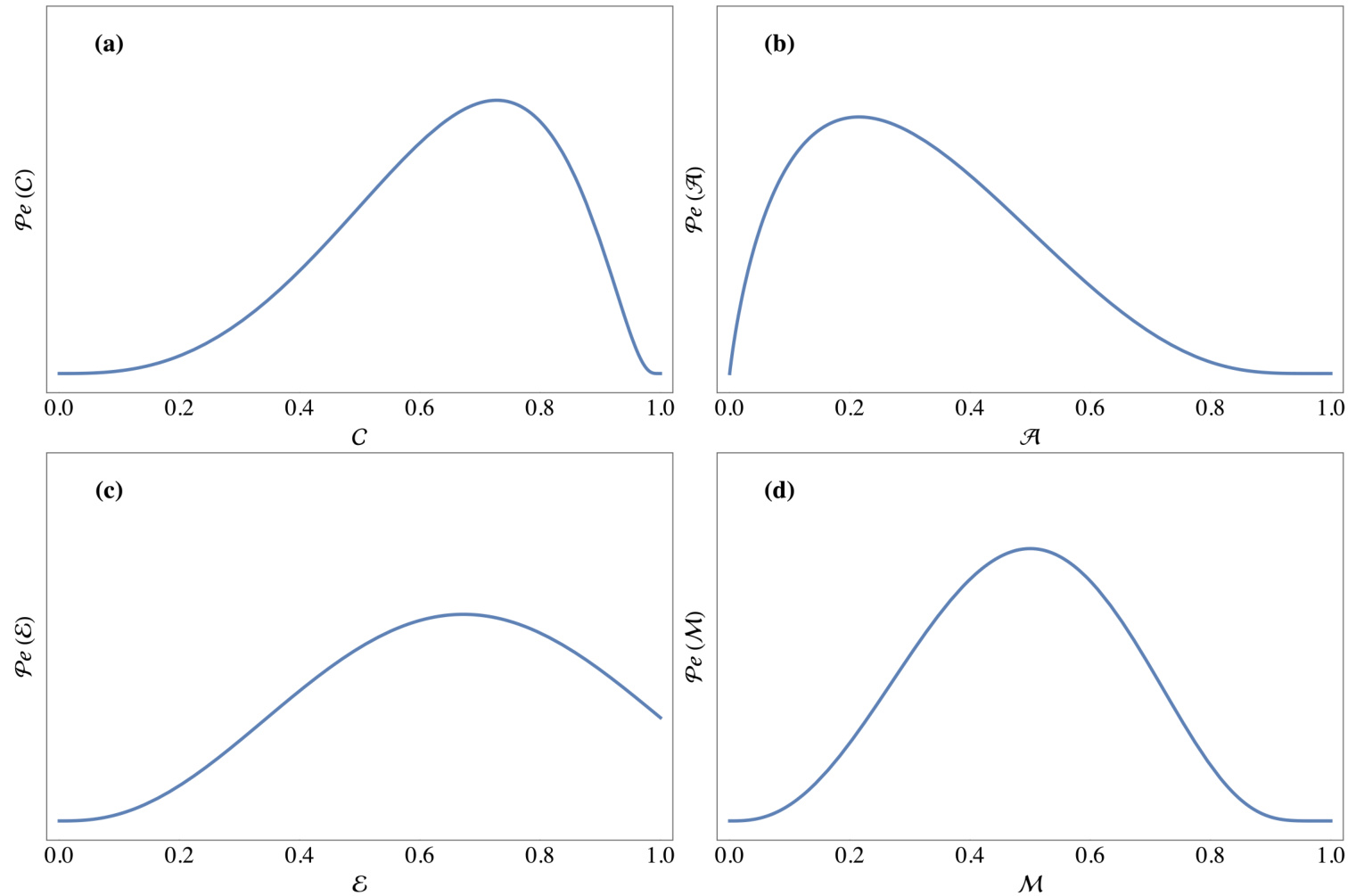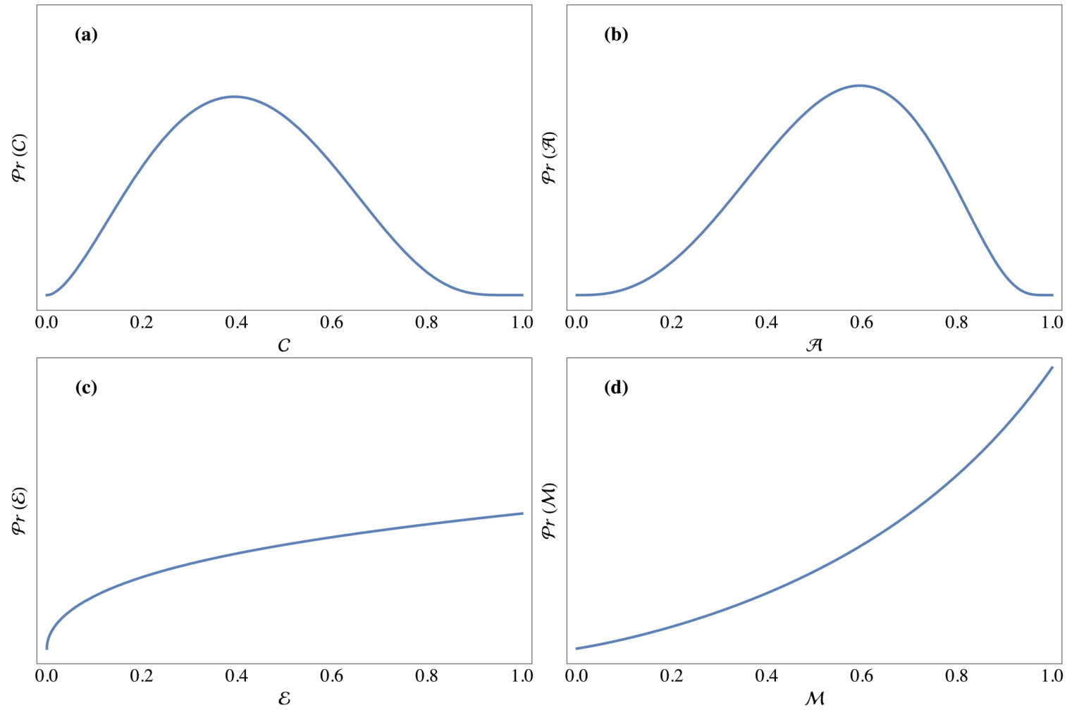 P(X) = \frac{1}{N} X^l \exp\left[-m\left(\frac{X}{1-kX}\right)^n\right], \quad X \in \{\mathcal{C},\mathcal{A},\mathcal{E},\mathcal{M}\}