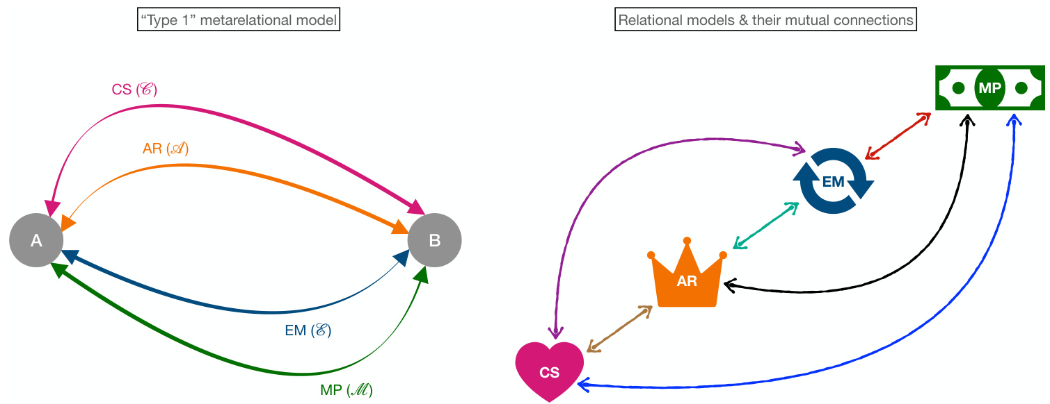 展示了“Type 1”元关系模型结构,两社交主体间四社会性模式强度的构成及其六对二元关系的相互作用示意图。图左指明四参数和为1,说明它们构成完整配比;图右则示意模型间负相关张力(如CS对MP形成压制)。此图为论文数字模型的直观出发点。[page::8]