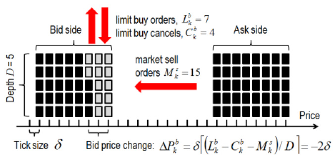 - 模型引入订单簿深度上限D(示例中为5),利用队列和价格变动的比例关系表达价格的动态变动。