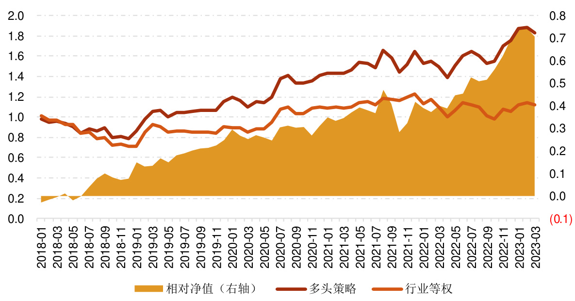 - 2016年至2023年3月,策略年化收益13.71%,最大回撤23%,净值累积至2.03,优于万得全A及行业等权指数。