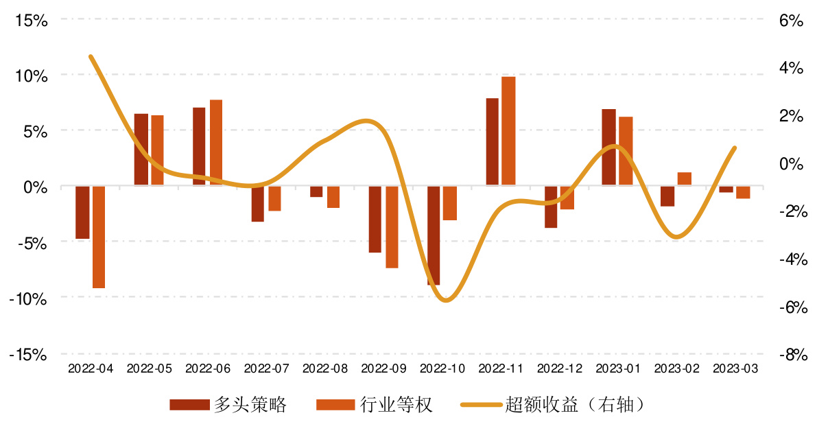 - 展示模型驱动的多头策略与行业等权指数月度收益对比及超额收益表现。