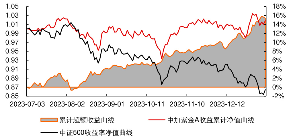 图1展示了中加紫金A自2023年7月1日至2024年1月11日的累计净值曲线(红色)和基准净值曲线(黑色),橙色填充区域表示累计超额收益。图2与图1类似,基准由中证500指数替代。
