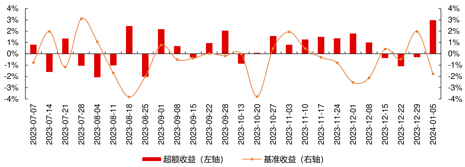 图6显示每周超额收益条形,基准收益线趋势;表5列举基准上涨和下跌期间超额收益的均值、累计值及胜率。